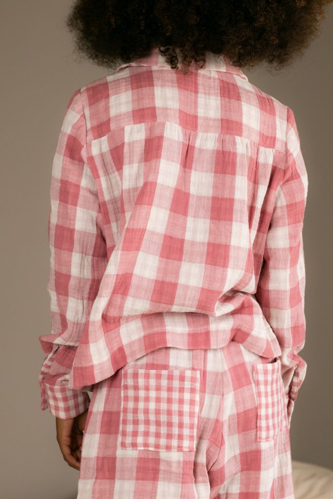 De mouwboorden werkte ik af met de achterkant van de stof, waardoor er subtiel een ander patroon zichtbaar wordt. Ook voegde ik een borstzakje toe, maar naaide dit lager op de blouse voor een speelser, huiselijk effect.