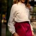 De mouwboorden werkte ik af met de achterkant van de stof, waardoor er subtiel een ander patroon zichtbaar wordt. Ook voegde ik een borstzakje toe, maar naaide dit lager op de blouse voor een speelser, huiselijk effect.