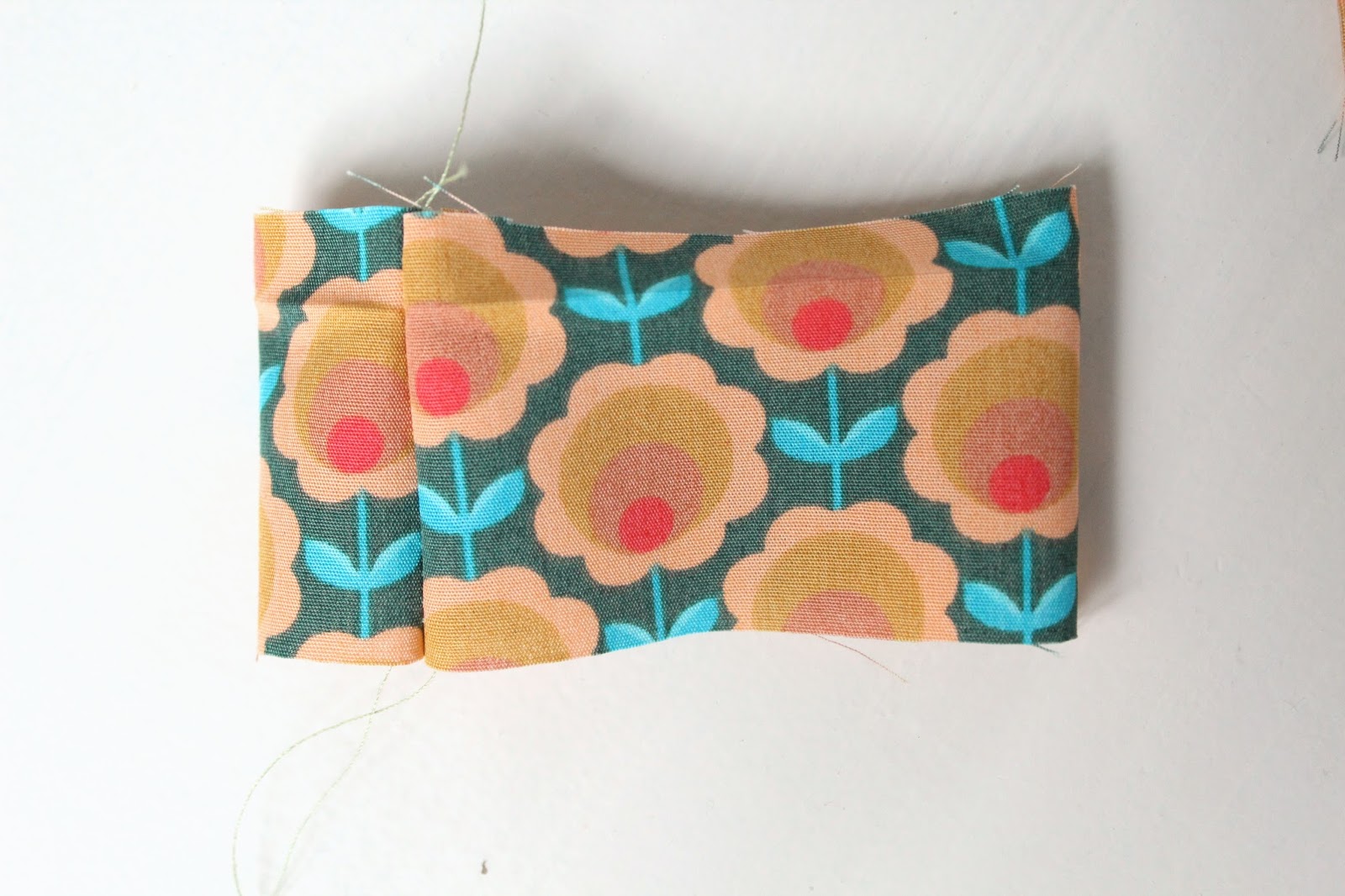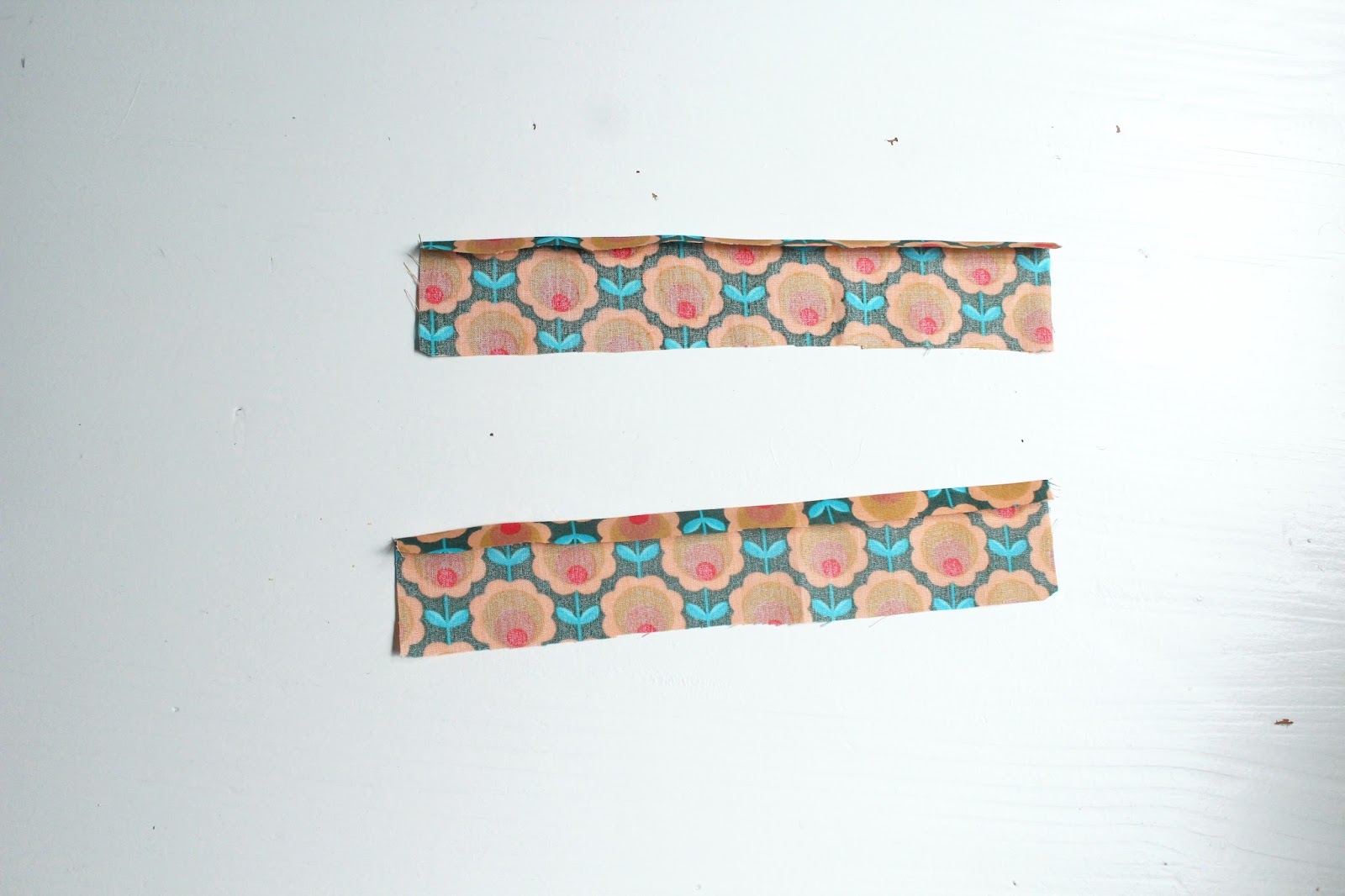 Strijk nu ook de zijkant van het knopenbeleg 1 cm om naar binnen (zoals we eerder deden bij het bovenstuk, het knopenbeleg moet namelijk doorlopen in de rok).