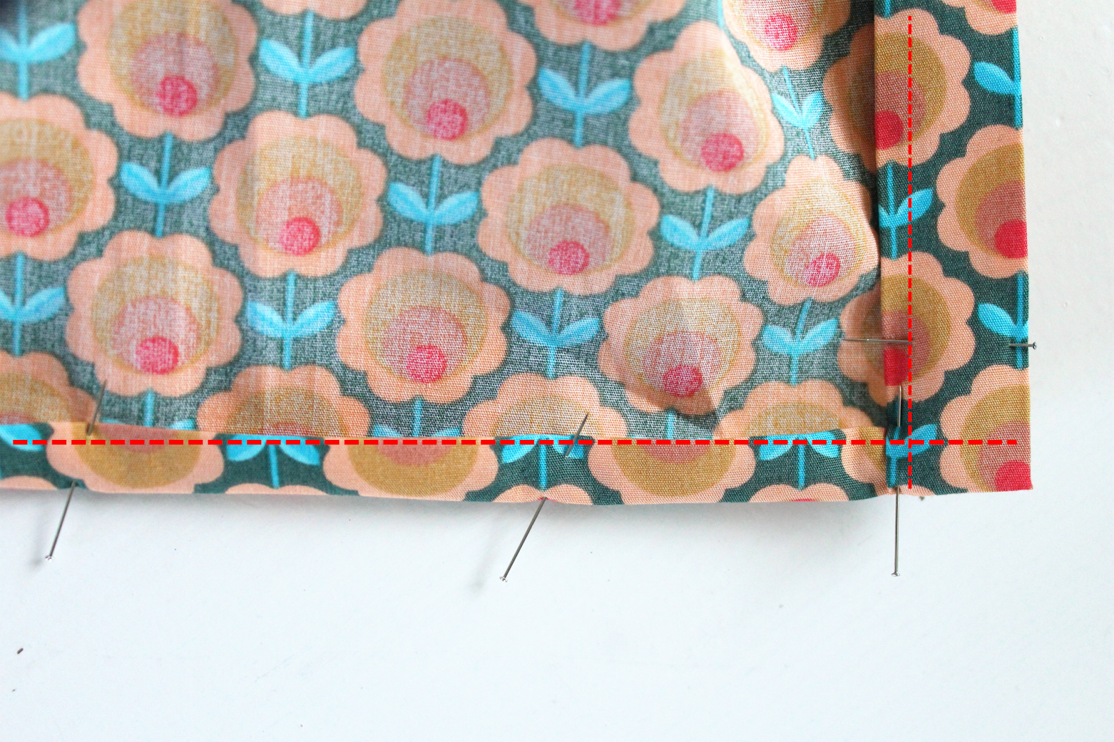 Naai de plooi vast ter hoogte van de rode stippellijn.