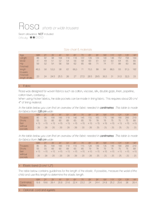 Rosa is a pattern for children that can be used to make long wide trousers as well as wide-fitting shorts with a high waist. The pattern contains pattern pieces for sizes 18M- 14Y (hip circumference 50 – 86). The pattern is designed for non-elastic fabrics such as cotton, viscose, linen, poplin, (raw) silk, double gauze…